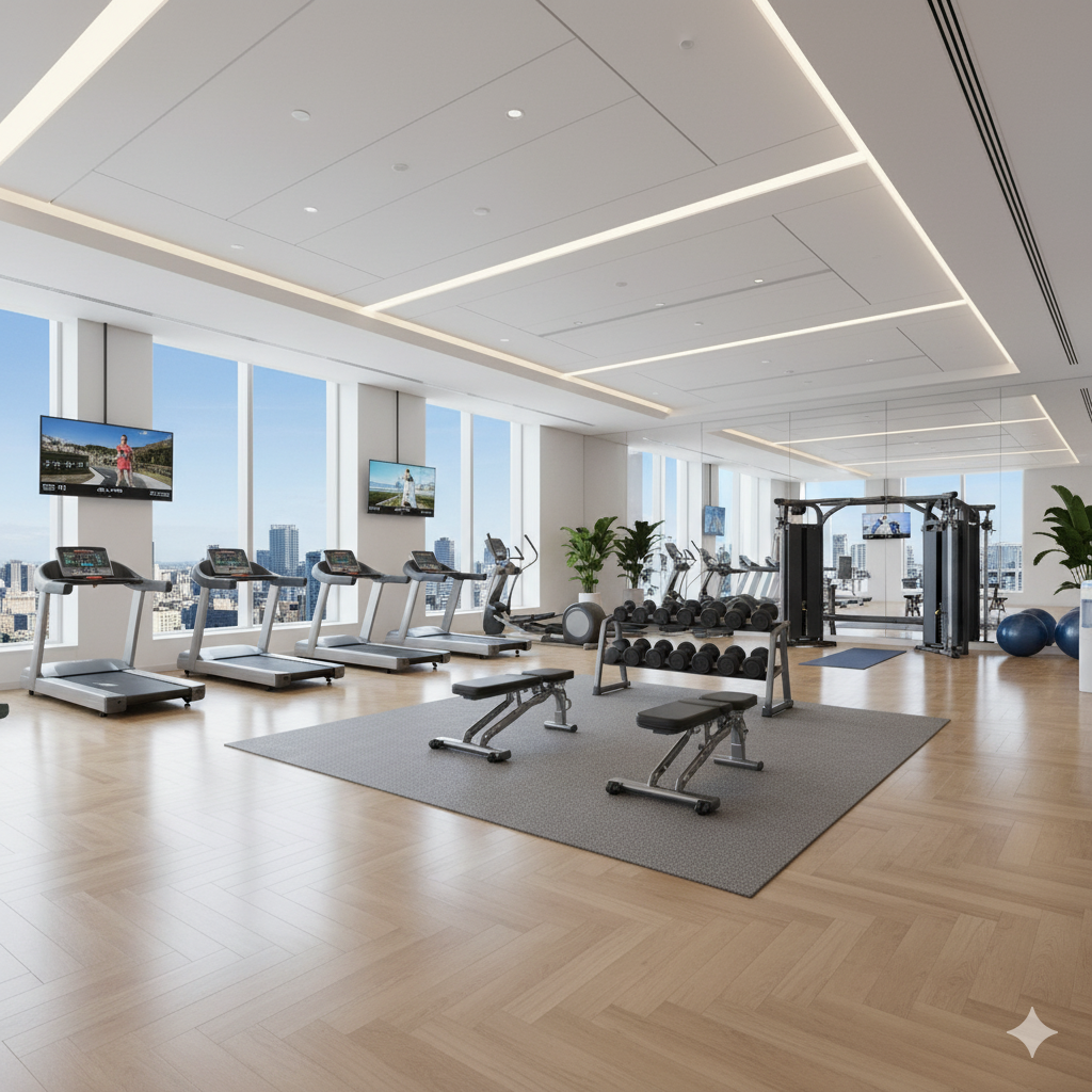 The Gym is equipped with state-of-the-art machines, free weights, and dedicated spaces for cardio, strength training, and stretching.